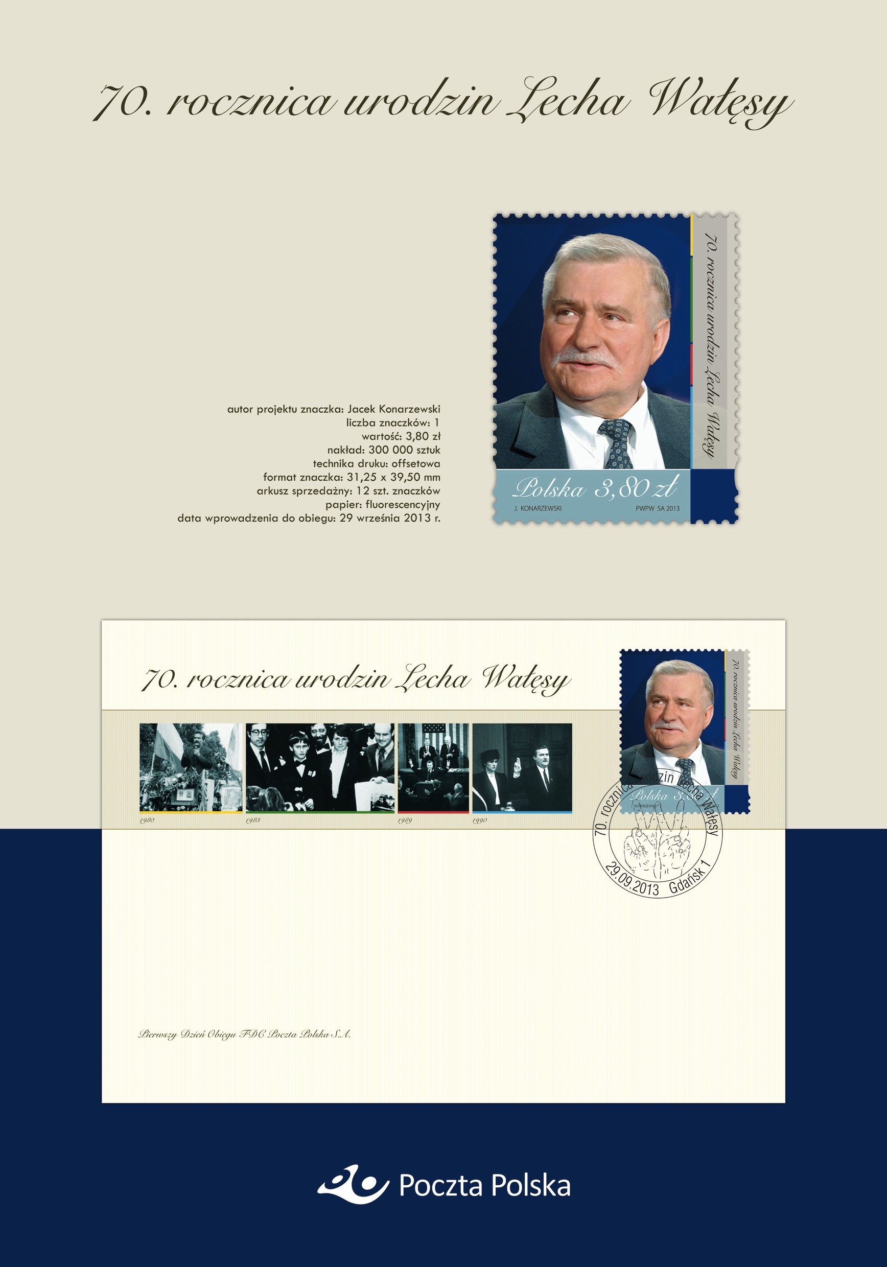 Poland’s Post Office will issue a stamp in honor of Solidarity (Solidarność) trade union leader Lech Wałęsa. The stamp will be released Sunday, September 29, 2013, on the Nobel Peace laureate’s and Poland’s former President’s 70th birthday.