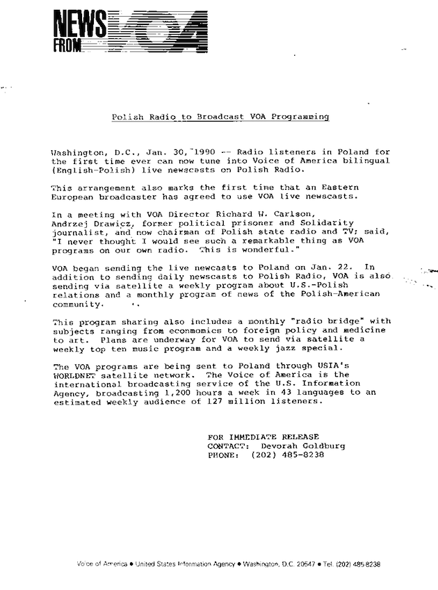 In January 1990, radio Listeners in Poland for the first time ever could tune into Voice of America bilingual (English-Polish) live newscasts on Polish Radio’s nationwide network. This arrangement also marked the first time an Eastern European broadcaster had agreed to use VOA live newscasts. Also in January 1990, the VOA Polish Service and Polish Radio conducted a joint live news conference and a call-in program with Dr. Zbigniew Brzezinski.