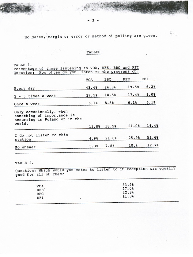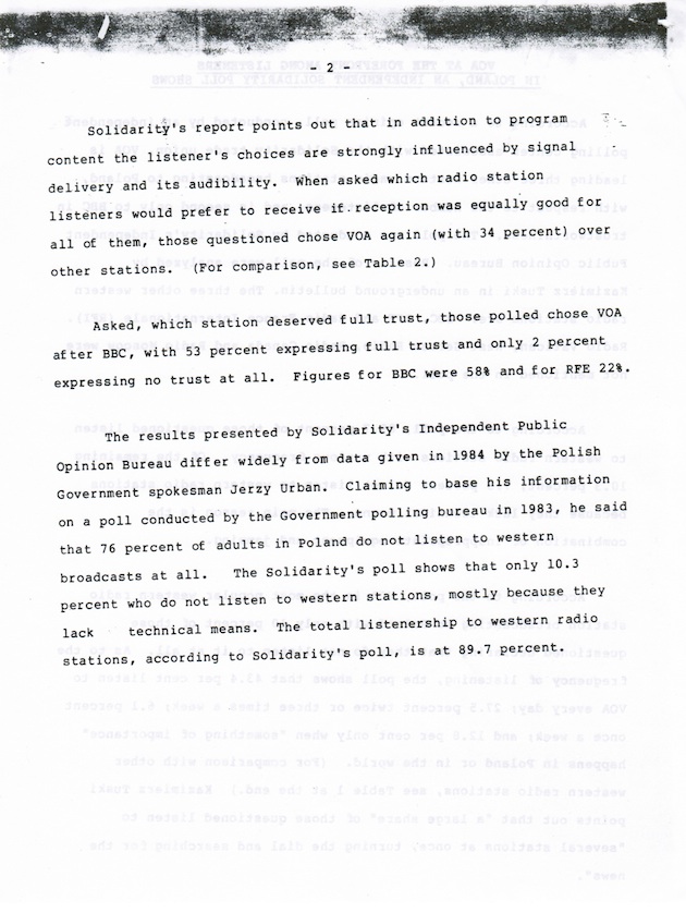 In the late 1980s, according to a Solidarity poll and audience research conducted USIA, the VOA Polish Service reached the largest percentage of radio listeners among all countries to which VOA broadcast radio programs at that time. The following USIA report is from 1986.