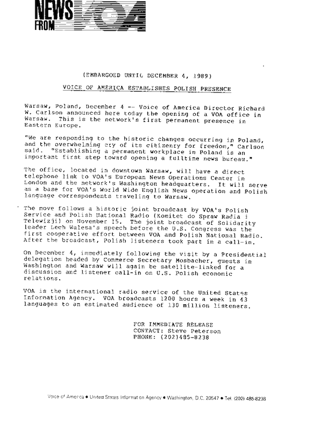 In December 1989, Voice of America Director Richard W. Carlson announced the opening of a VOA office in Warsaw. “Establishing a permanent workplace in Poland is an important first step toward opening a full-time news bureau,” Carlson said.