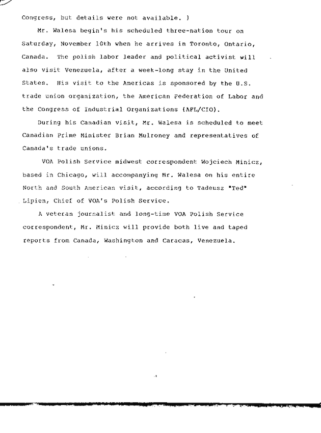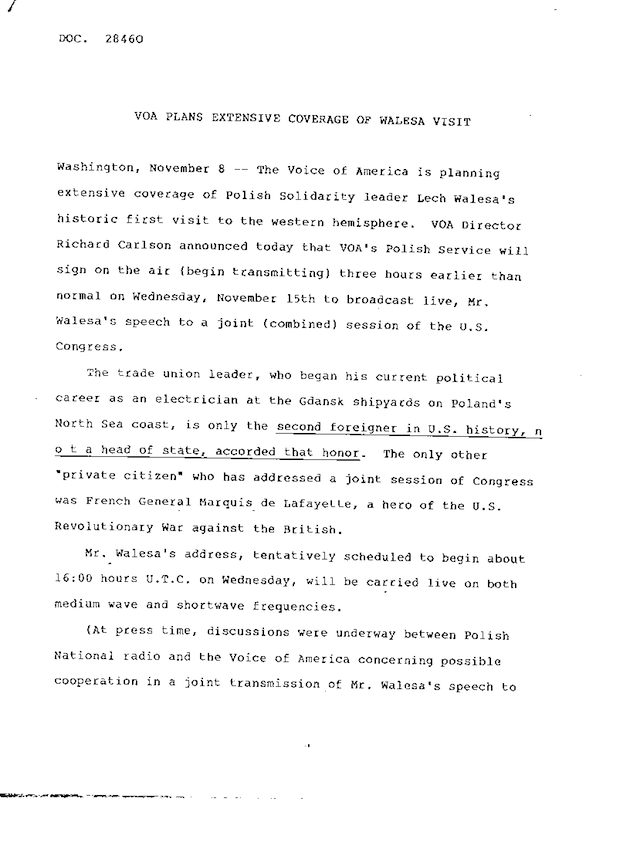The move followed a joint broadcast by VOA’s Polish Service and Polish National Radio on November 15. The joint broadcast of Solidarity leader Lech Walesa’s speech before the U.S. Congress was the first cooperative effort between VOA and Polish National Radio. After the broadcast, Polish listeners took part in a call-in.
