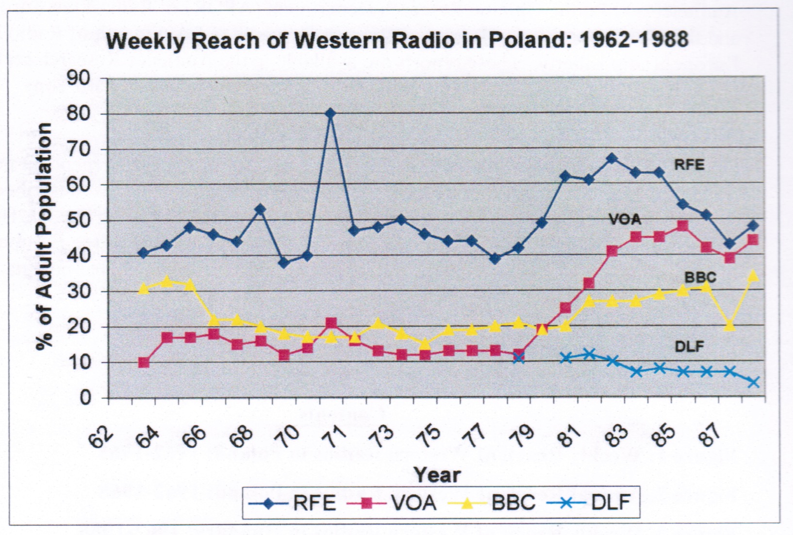 Source: Audience and Public Opinion Research Department (APOR) of Radio Free Europe and East European Audience and Opinion Research (EEAOR) of RFE/RL. Surveys were conducted among travelers from Eastern Europe by independent market research firms in Western Europe. They were presented at the Conference on Cold War Broadcasting Impact, Stanford University, October 2004.
