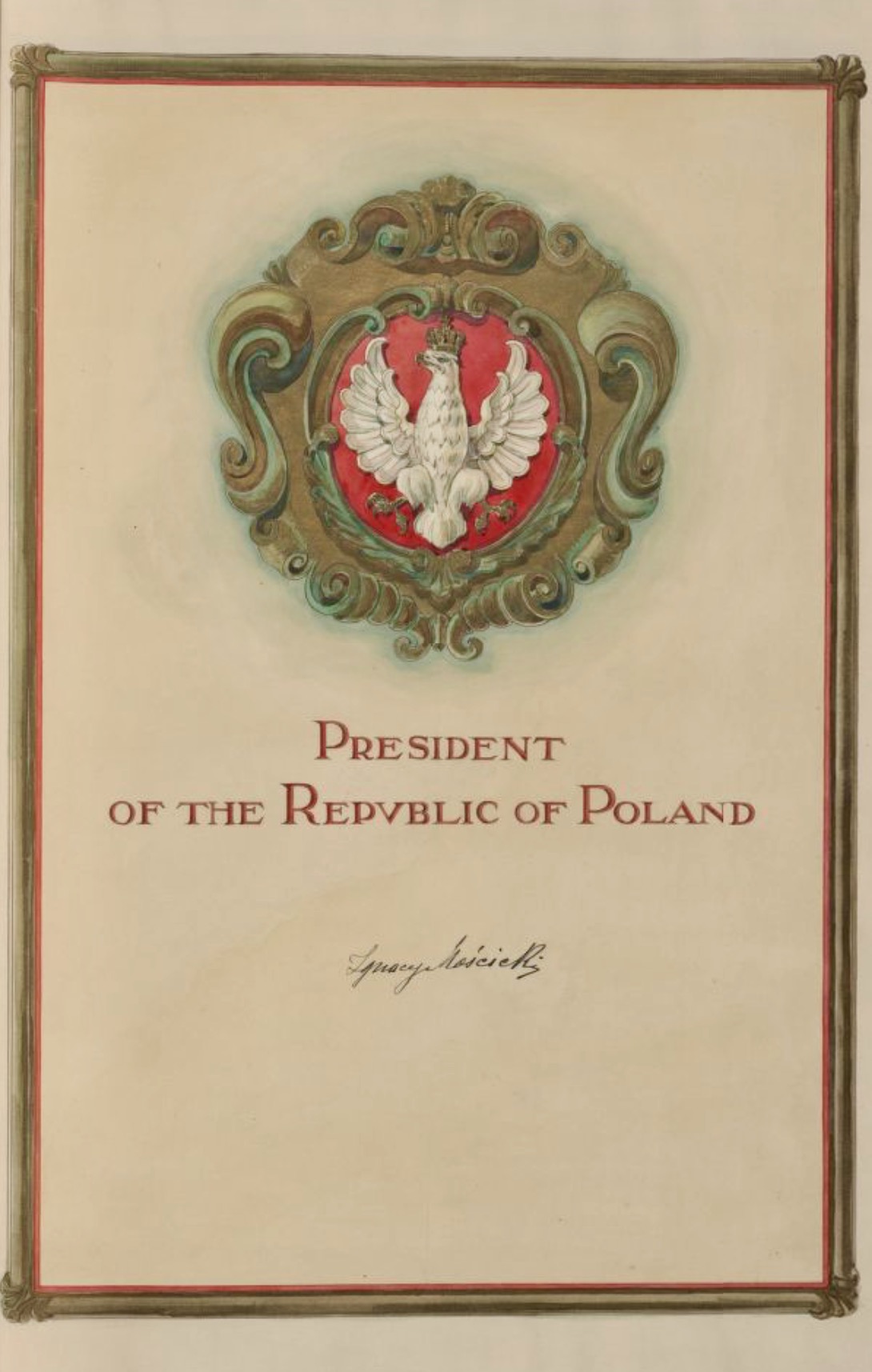 The richly illustrated Volume 1 contains the signatures of central government officials including President Ignacy Moscicki; Jozef Pilsudski (who, although holding the title of minister of military affairs, exercised actual executive authority and, notably, signed the sheet without indicating his position); members of the Senate and Sejm, the Council of Ministers, the General Staff, and the Supreme Court; religious dignitaries, including the Primate of Poland, Cardinal Aleksander Kakowski; and officers and rank-and-file members of a wide range of national professional associations, institutes, and social organizations based in the capital city, Warsaw. Many of the signed sheets have finely drawn illustrations of buildings, coats of arms, historical monuments, rural and city scenes, and portraits of famous historical figures. The signatures are often accompanied by official seals.