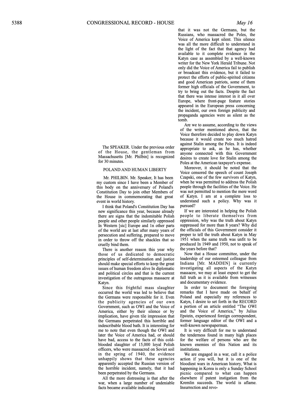 Philip J. Philbin (D-MA), 82nd Congress, Second Session, Congressional Record, Part 4-17, May 16, 1952, page 5388.