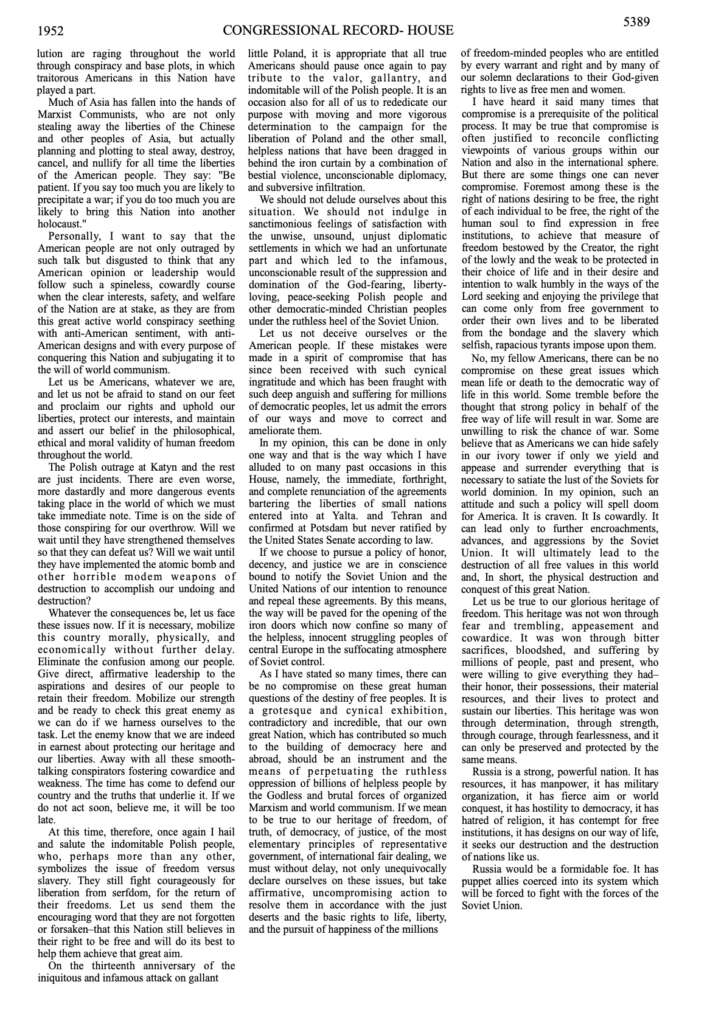 But Soviet communist officials were not the only ones participating in the Katyn coverup. In 1950, during a visit to the United States from France, where Czapski lived in exile after the war, some of his comments about his search for Katyn victims were deleted by the Voice of America (VOA). The censorship of Czapski’s Katyn statement was exposed by Congressman Philip J. Philbin (D-MA) in a speech on the floor of the U.S. House of Representatives on May 16, 1952.[ref]Philip J. Philbin (D-MA), 82nd Congress, Second Session, Congressional Record, Part 4-17, May 16, 1952, page 5388. https://www.govinfo.gov/content/pkg/GPO-CRECB-1952-pt4/pdf/GPO-CRECB-1952-pt4-17-2.pdf[/ref] He mentioned VOA’s interference with Czapski’s program and spoke about warnings by former Office of War Information journalist Julius Epstein about a pro-Soviet bias in Voice of America broadcasts. VOA officials tried to discredit Epstein and his claims, but later, in response to pressure from Congress and the Truman White House, changed their policy directives and allowed full coverage of the Katyn story. Prior to the policy change, which had the support of Truman’s Secretary of State Dean Acheson, VOA director (1949-1952) and State Department diplomat Foy D. Kohler, even suggested that Epstein, who was a refugee from Nazi Germany, was perhaps unworthy of being a naturalized U.S. citizen and should be investigated.[ref]Memorandum from Foy D. Kohler (OIB/NY) to All Commission Members, December 18, 1951; RG 0059, Department of State, U.S. International Information Administration/International Broadcasting; Entry# P315: Voice of America (VOA) Historical Files: 1946-1953; Reports Psychological Operations POC THRU Katyn Forest Massacres III; Container #18; National Archives at College Park, College Park, MD.[/ref] VOA officials claimed there was no censorship and that Czapski had agreed to the shortening of his program after being told that the Polish Service would produce its own commentary. This claim by VOA officials was essentially false. Czapski was outraged by the removal of his references to Katyn.