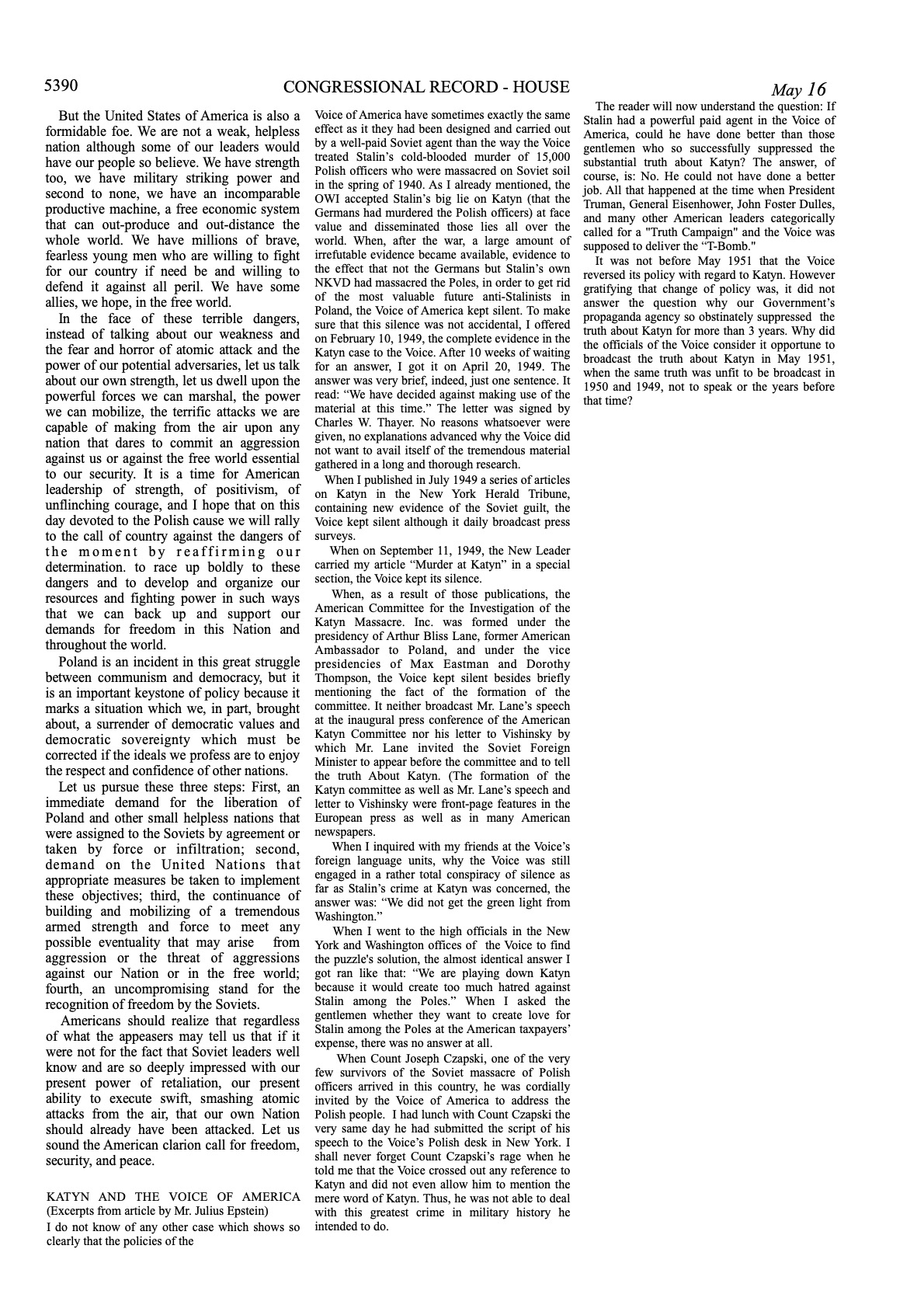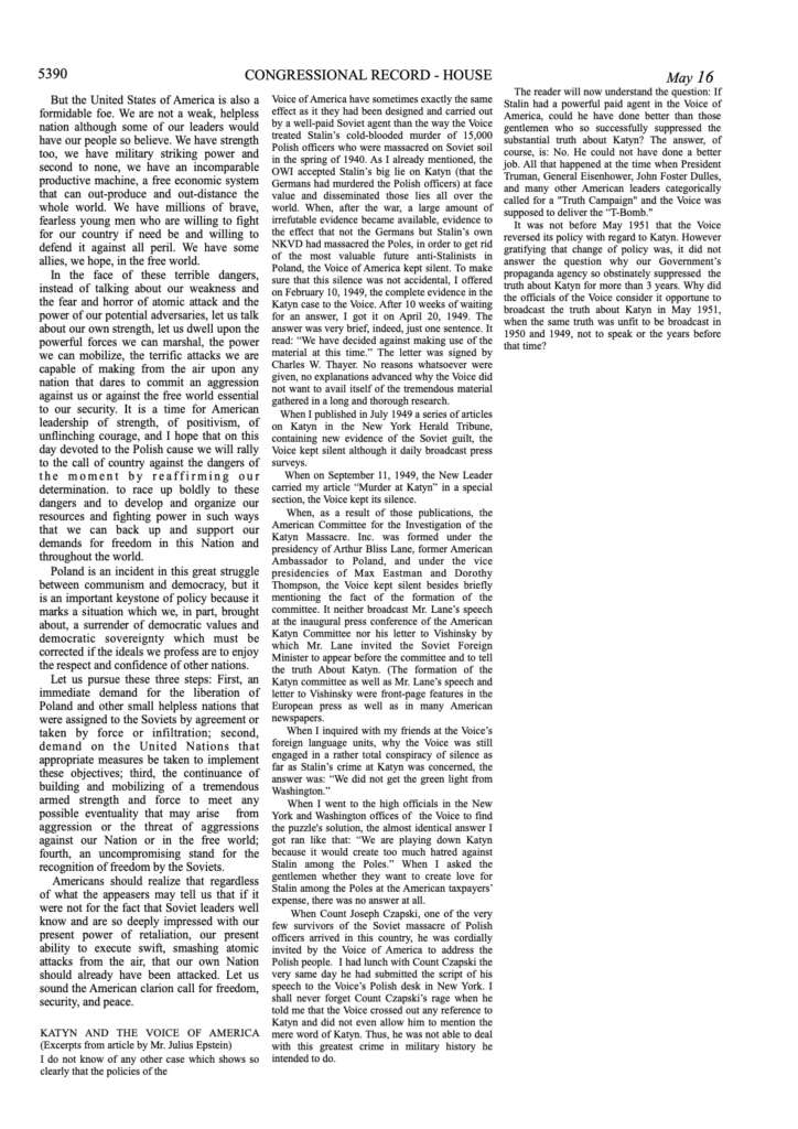 Are we to assume, according to the views of the writer mentioned above, that the Voice therefore decided to play down Katyn because it would create too much hatred against Stalin among the Poles. It is indeed appropriate to ask, as he has. whether anyone connected with this Government desires to create love for Stalin among the Poles at the American taxpayer’s expense.