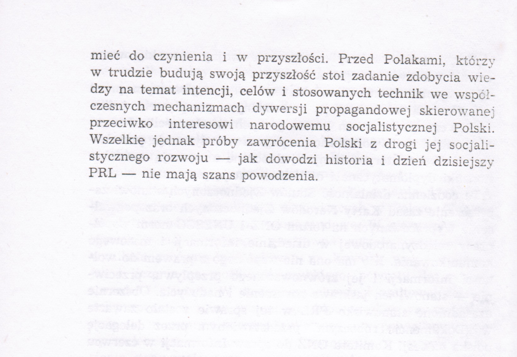 The long-term nature of the strategic anti-communist goals represented by the American administration proves that we will have to deal with manifestations of anti-Polish activity in the future. Poles who are struggling to build their future are faced with the task of acquiring knowledge about the intentions, goals and techniques used in the contemporary mechanisms of propaganda sabotage directed against the national interest of socialist Poland. However, all attempts to turn Poland back from its socialist development — as the history and present day of the Polish People’s Republic prove — have no chance of success.