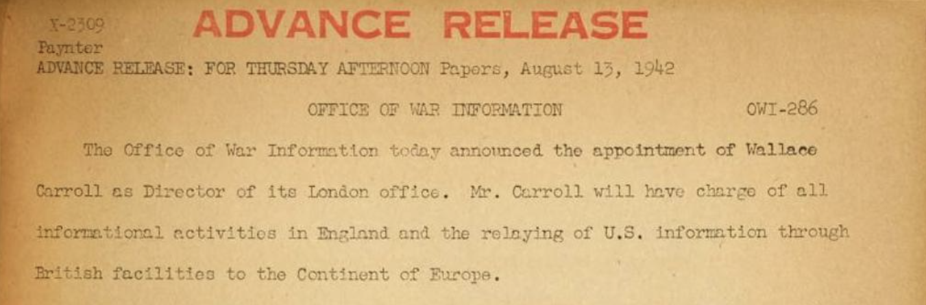 As the head of the OWI London office, Carroll advocated for close coordination of American and Soviet propaganda. He resigned at the end of 1943 when the OWI leadership in Washington did not agree with some of his proposals, but he returned to the agency in 1944 as deputy director for Europe in charge of Voice of America broadcasts.