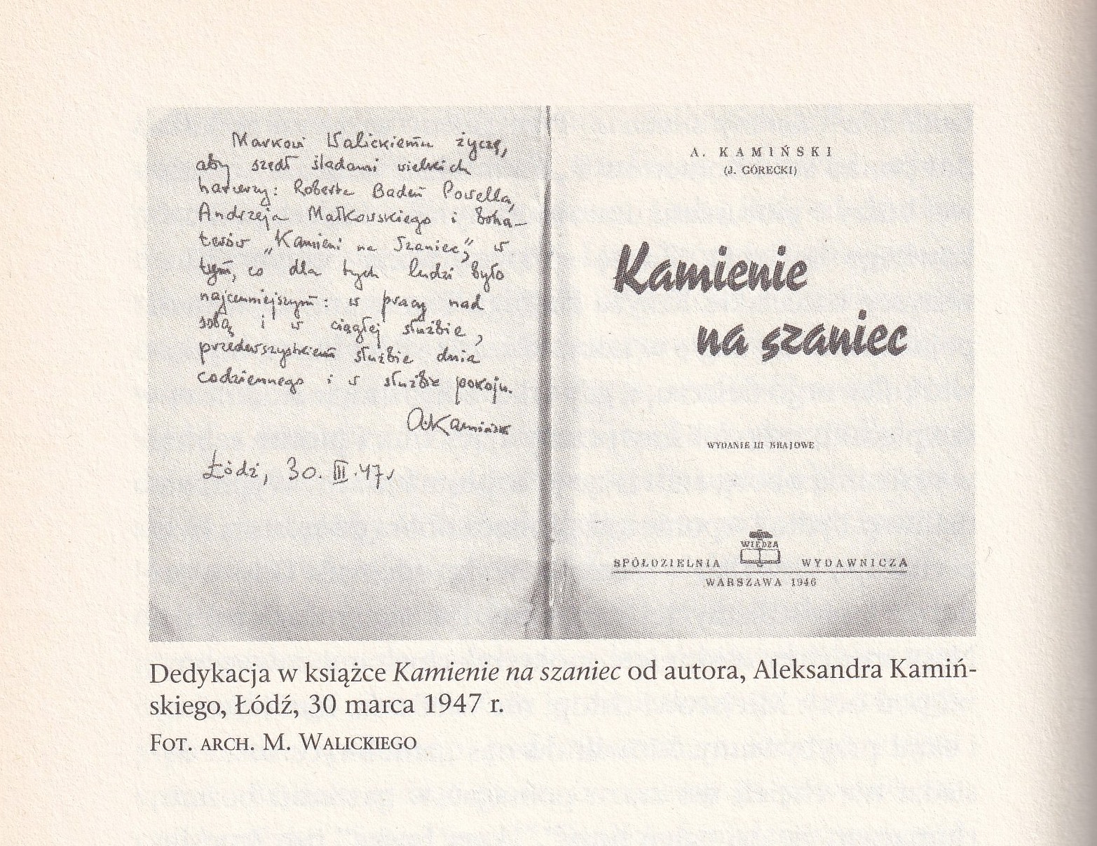Markowi Walickiemu życzę, aby szedł śladami wielkich harcerzy: Roberta Baden-Powella, Andrzeja Małkowskiego i bohaterów „Kamieni na szaniec,” w tym, co dla tych ludzi było najcenniejszym: w pracy nad sobą i w ciągłej służbie, przede wszystkim służbie dnia codziennego i w służbie pokoju. A. Kamiński, Łódź, 30 III 47 r.